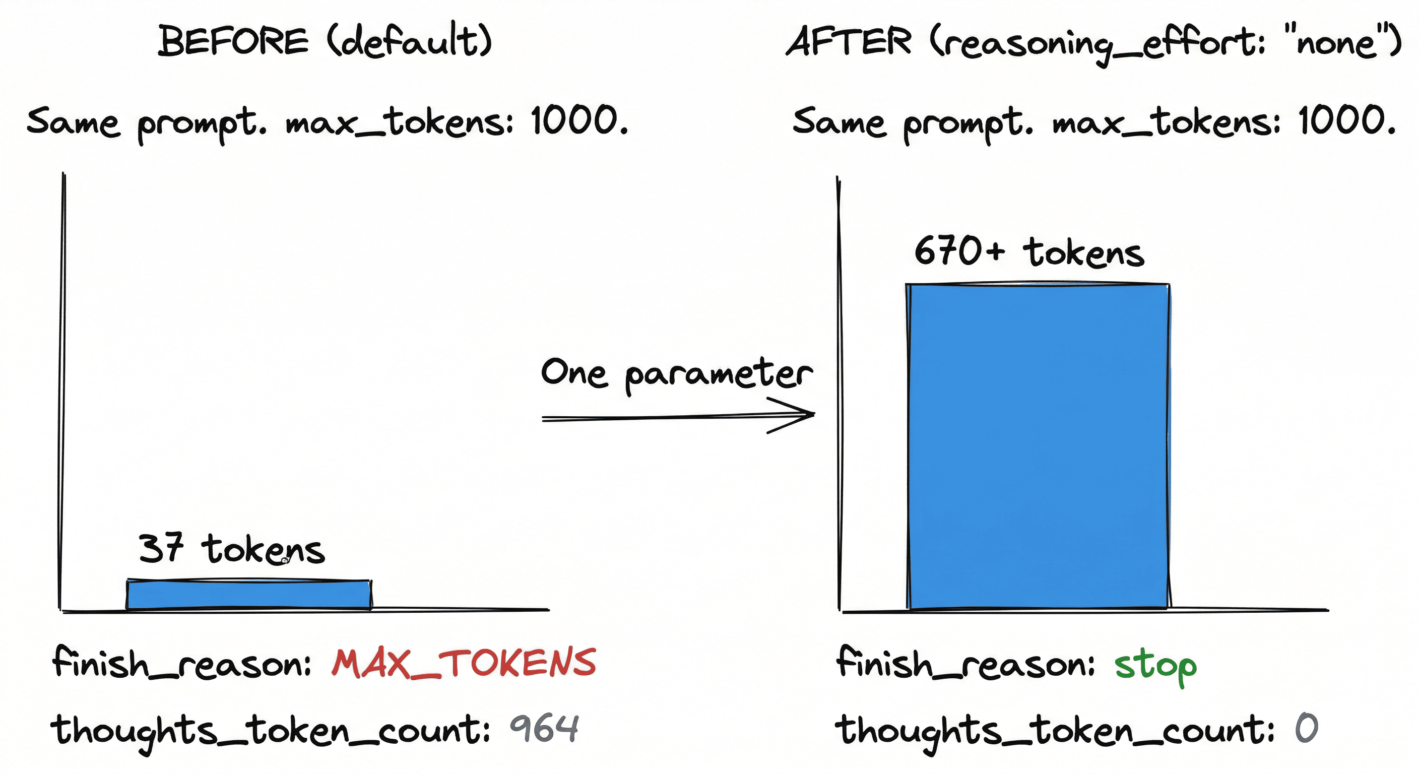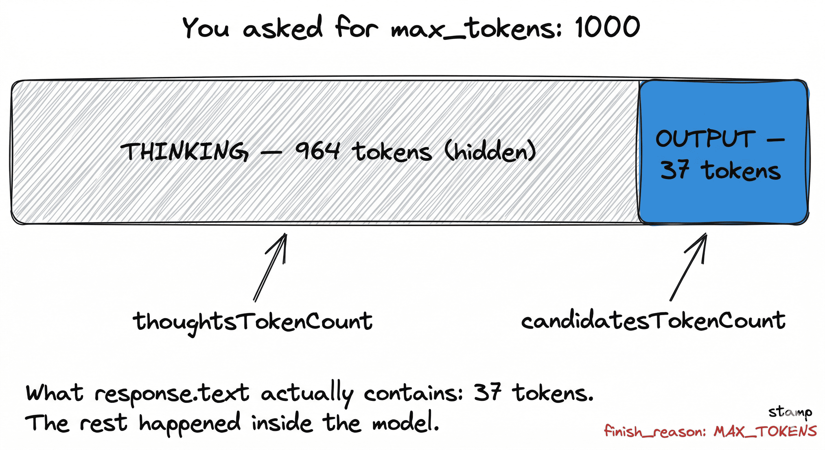 I set max_tokens=1000 on a Gemini 2.5 Flash call. Got back 37 tokens. No error, no warning. The real cause was reasoning tokens eating the output budget, a bug documented in 15+ open GitHub issues but missing from every tutorial. Here is the full debugging trail, the three-tier fix with tradeoffs, and a diagnostic script.