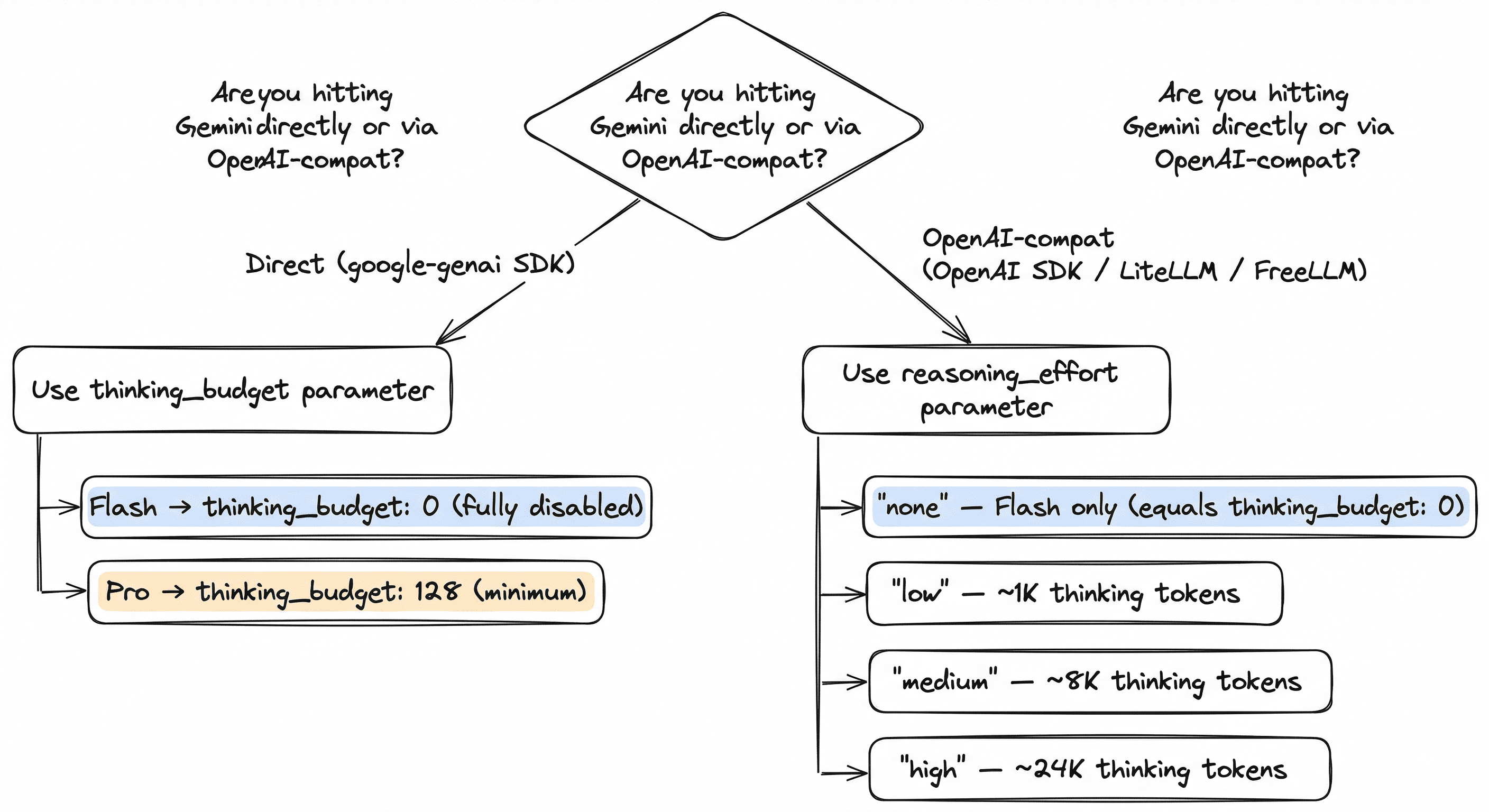reasoning_effort: "none"→thinking_budget: 0(Flash only)reasoning_effort: "low"→thinking_budget: 1024reasoning_effort: "medium"→thinking_budget: 8192reasoning_effort: "high"→thinking_budget: 24576